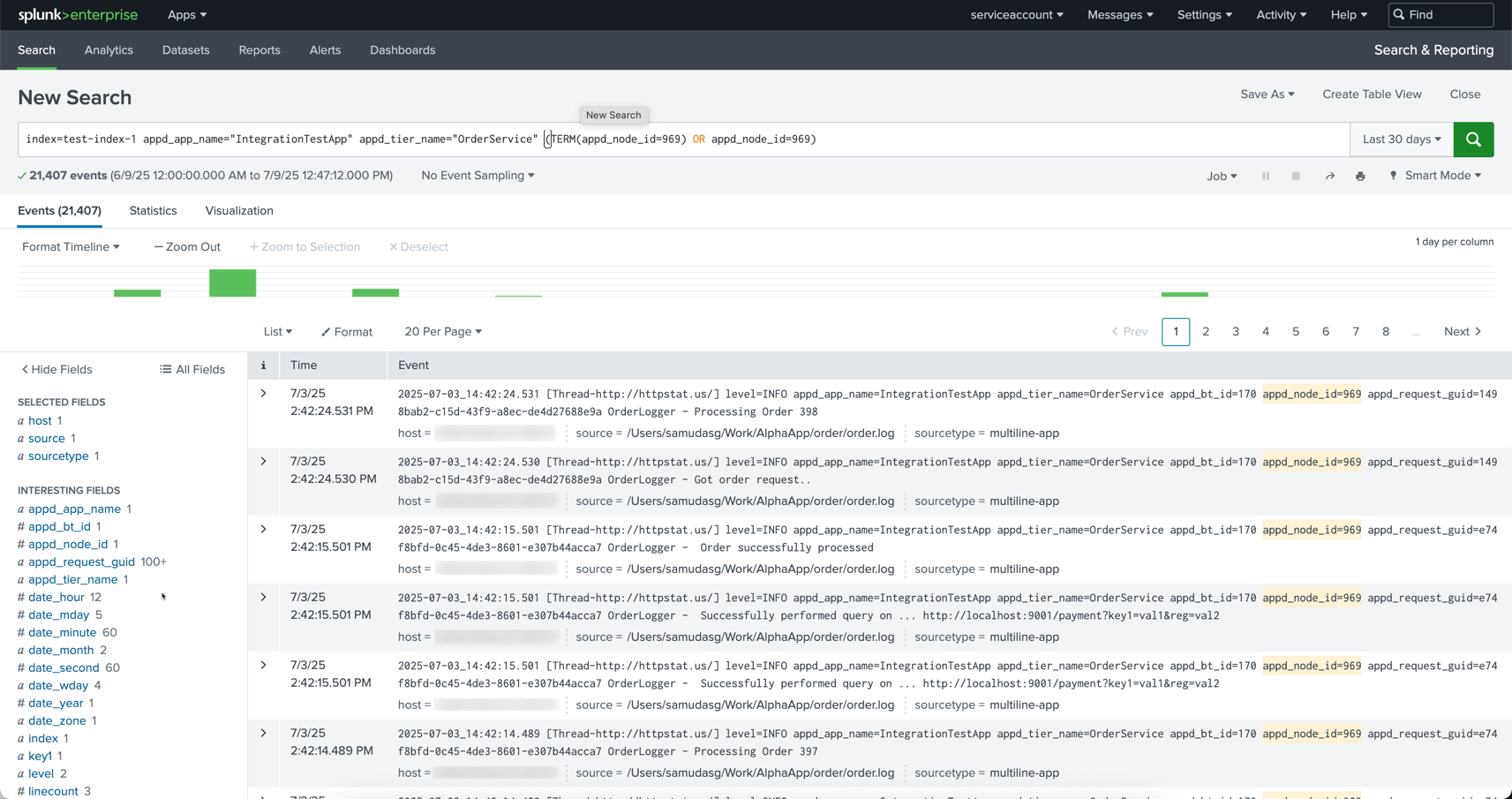 This opens a new tab with the Splunk Enterprise UI where you can view the logs in-context of the node and the selected time range. The selected node is added as a search query on the Splunk Enterprise UI.
