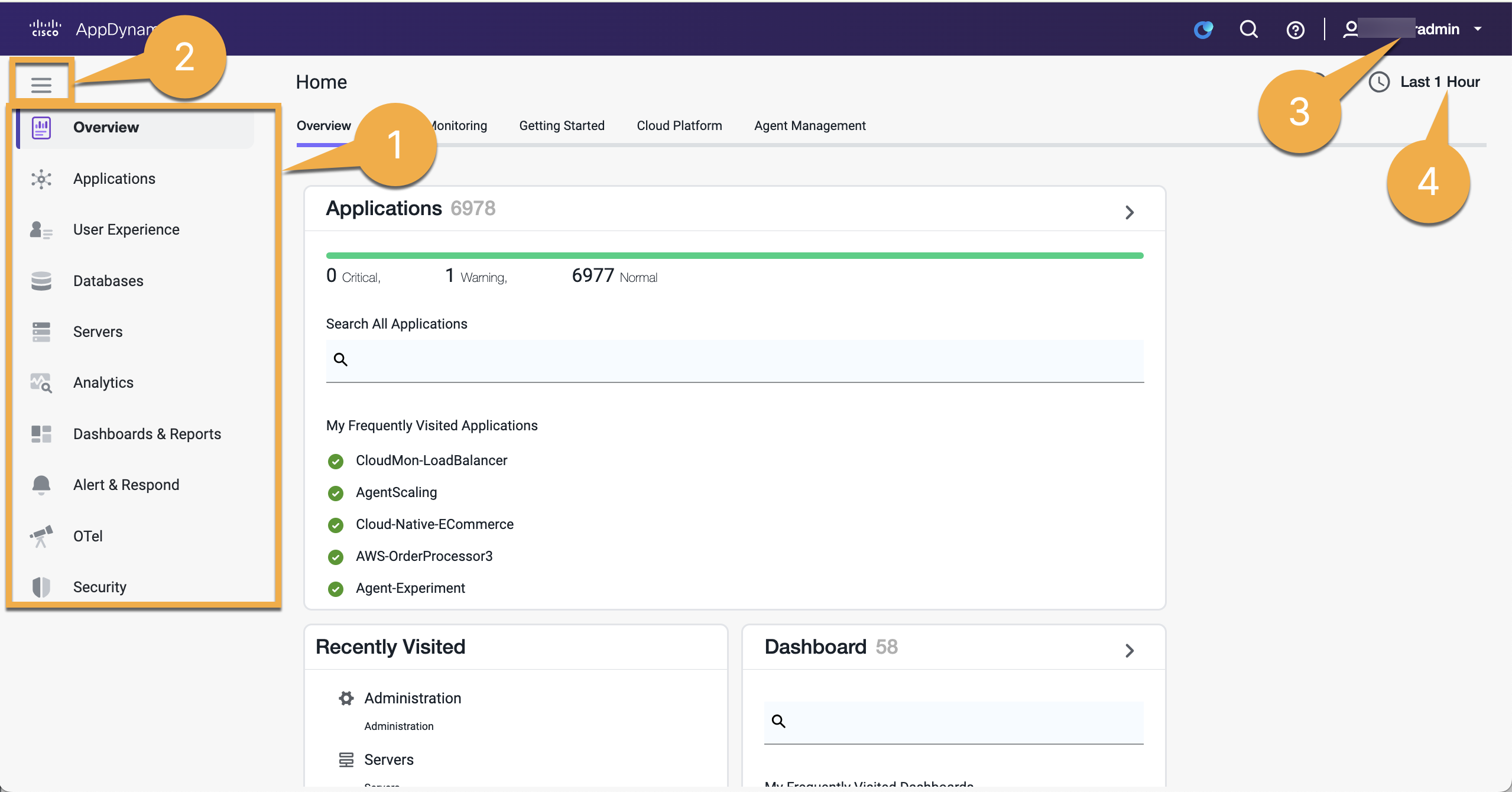 The precise controls and features available to you depend on your user account permissions and product module licenses. For example, you can have additional controls in application monitoring screens with an Analytics license. See Manage Custom Roles.